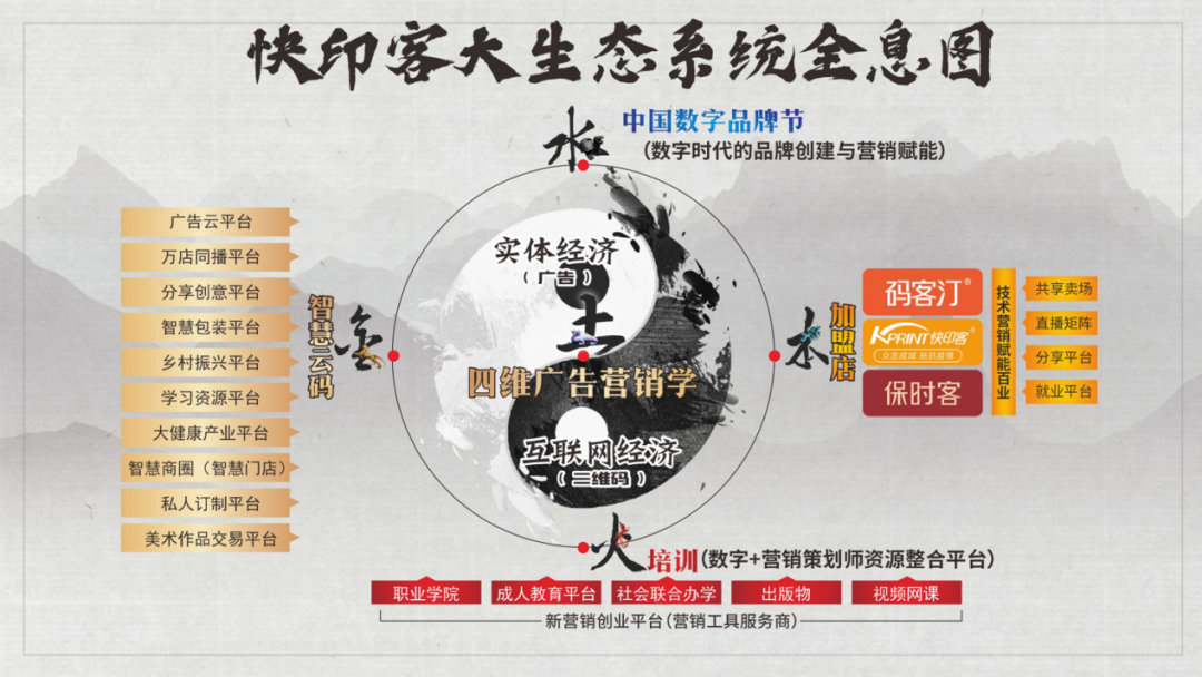 紧接着,牛云老师深入讲解了快印客大生态系统的概念,它是以四维广告营销学为理论依据,通过互联网技术(以二维码为入口)实现广告的赋能升级,进而帮助企业突破经营维度,通过颠覆性创新实现业绩倍增。并且结合“五行能量法”揭示企业经营的奥秘:“金”是智慧云码,包括广告云平台、万店同播平台、智慧商圈等;“火”是“数字+营销策划师”资源整合平台;“木”是码客汀、保时客品牌加盟店,打造可以精准获客的广告;“土”就是四维广告营销学下的经济模式,又分为“阳”土(实体经济)和“阴”土(互联网经济);中国数字品牌节则是“水”,在数字时代为品牌创建源源不断地进行营销赋能。在技术营销的影响下,五行之间相互滋生和促进,通过连接、分享、裂变,开创一个崭新的广告新生态。